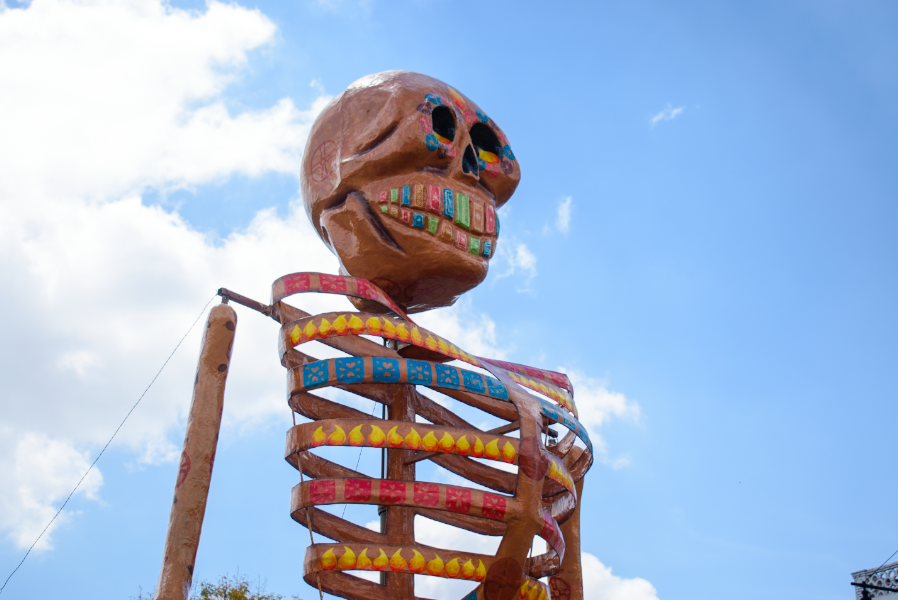 Una calavera panadera simboliza a la comunidad, portando su pala y canasto lleno de pan recién horneado, homenaje a quienes mantienen viva esta deliciosa tradición.