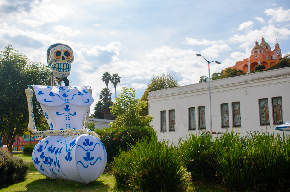 Esta catrina talavera rinde homenaje a los talleres artesanales de San Francisco Acatepec y Santa María Tonantzintla, portando un vestido y accesorios inspirados en los característicos tonos azules y blancos de esta tradición ancestral.